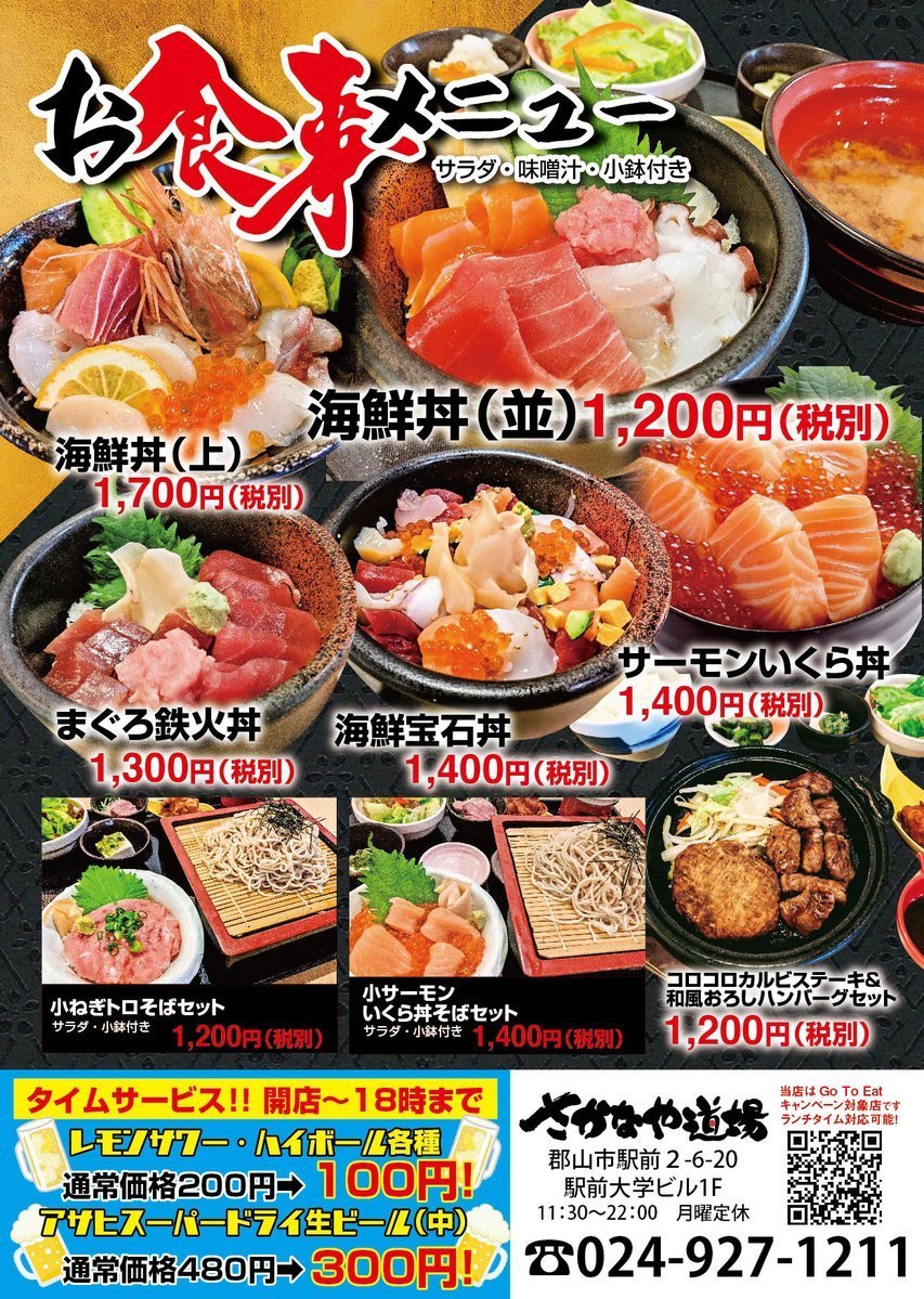 11/5「さかなや道場」の本格海鮮丼などランチスタート!ランチもGoToEat対象店!ランチは500ポイント、夜は1000ポイントGET!福島県プレミアムお食事券、GoToトラベル地域共通クーポンも使えます✨TEL024-927-1211 #郡山 #郡山ランチ #海鮮丼 #ランチ #郡山駅前 #GOTOキャンペーン #GoToEat #福島県